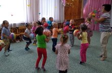 Җәйге чорда залда музыка Һэм физкультура эшчәнлекләре дәвам итә. Икенче кечкенәлэр төркеме балалары физкультура эшчәнлегендү туплар белән кунегуләр эшләделэр, биеделәр, уйнадылар.