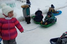 Кечкенәләр төркемендә прогулка вакытында төрле хәрәкәтле,кышкы уеннарны балалар бик яратып уйный. Буген балалар бер-берсенә ярдәм итеп,дус-тату булып тау шудылар./Во время прогулки дети младшей группы любят играть в зимние забавы. Сегодня они катались санками с горки, помогали друг - другу и радовались