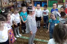 1. Балаларга күп хәрәкәтләнергә кирәк. Шуның өчен актив һәм тыныч эшчәнлек алыштырылып барыла. Уен алымнарын ничек урынлырак куллансаң, бала материалны шулхәтле ныграк үзләштерә. Фотода уртанчылар төркеме балалары “A cat and a mouse” (“Песи һәм тычкан”) уенын уйныйлар ./Детям нужно много двигаться. Поэтому обязательно чередуются спокойная и активная деятельность. Чем уместнее используются игровые приемы на занятиях, тем дети успешнее усваивают материал. На фото воспитанники средней группы играют в игру “A cat and a mouse”.