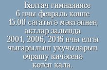 Балтач гимназиясе 6 нчы февраль көнне 15:00 сәгатътә мәктәпнең актлар залында 2001, 2006, 2016 нчы елгы чыгарылыш укучыларын очрашу кичәсенә көтеп кала. Рәхим итегез!
