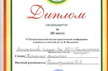 7нче Б сыйныфы укучысы, Әхмәтханова Зәйнәп Д.В.Вилькеев исемендәге VI Республика укучылар һәм укытучылар фәнни-гамәли конференциясендә III урынны яулады. Зәйнәпне һәм аның җитәкчесе Д.Х.Гыйниятуллинаны зур җиңүләре белән котлыйбыз.