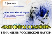 5 февраля, в рамках проекта «Разговоры о важном» состоялось внеурочное занятие по теме: «День российской науки. 190 лет со дня рождения Д. Менделеева». Цель занятия: познакомить обучающихся с фактами из жизни Д. И. Менделеева, показать многогранность его профессиональных и жизненных интересов, формировать понимание значимости труда людей разных профессий для развития российской науки и улучшения качества жизни людей, воспитывать уважение к людям науки и их достижениям. Классные руководители рассказали ребятам об изобретениях великого химика, о современных достижениях российских учёных, об открытии новых материалов, создании новых технологий, разработке устройств, облегчающих жизнь человека. В конце занятия обучающиеся подвели итог.
