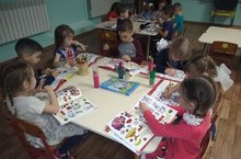 Ребята средней группы выполняют задания в рабочих тетрадях по русскому языку. Кто-то любит предпочитает работу с наклейками.