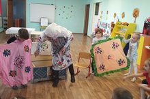Оста куллар уңган булган Әнисә апабызны үзебезгә кунакка чакырдык. Ул уз куллары белән теккән берсеннән-берсе матур калфаклар, ясалма гөлләр, кызлар өчен бизәнү әйберләре алып килгән. Ул балаларга үз эшенен нечкәлекләре турында сөйләде, калфак бизәү буенча мастер-класс күрсәтте.
