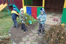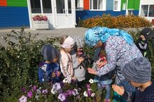 Зурлар төркеме балалары прогулкада хезмәт күнекмәләре алалар. Ислам, Риназ, Саша бик тырышып кипкән чәчәкләрне җыярга булышалар.