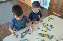 Мальчики собирают птичек из частей. У них закрепляется словарный запас. Повторяют название птиц, закрепляются названия частей: туловище, хвост, крылья, перья, клюв. Также дети учатся сравнивать, делать выводы.