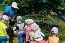 Кечкенәләр төркеме балалары балалар бакчасынын экологик сукмагы буйлап сәяхәткә чыктылар. Беренче тукталыш пион чәчәге.