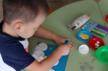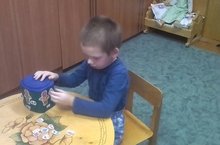 Марсель занимается настольной игрой, сделанной воспитателем по обучению русскому языку.