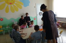 Район ЮХИДИ хезмәткәрләре белән очрашуда мәктәпкә әзерлек төркеме балалары үзләренең юл йөрү кагыйдәләре турында белемнәрен "Юллар әлифбасы" дип аталган ачык шөгыльдә күрсәттеләр һәм кунакларның истәлекле бүләкләренә ия булдылар.