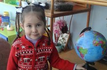 Наша Камиля изучает глобус, хочет найти планету Земля.