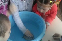 В нашем живом уголке живет любимая черепашка Афоня. Мы один раз в неделю моем черепашку в тазике. Она очень любит, когда с ней проводят водные процедуры.