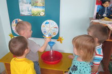 II кечкенәләр төркеме балалары I квалификацион категорияле тәрбияче Лутфуллина З.Ә. белән тәҗрибәләр үткәрү почмагында суның үзлекләре белән танышабыз. Суны бер шешәдән икенчесенә агызу өчен бүрәнкә (воронка) ярдәмендә тәҗрибә үткәреп карауны оештыру.