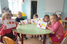 II кечкенәләр төркеме балалары белән кисеп-ябыштыру б.б.э. төрле төстәге түгәрәкләр ябыштырдык.