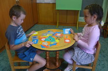 Используя символ-схемы дети подготовительной группы учатся составлять предложения с предлогами. Амир и Ралина стараются правильно построить предложения, сказанные воспитателям.
