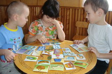 Дети старшей группы играют в игру "Логические пары". Они подбирают пары карточек, логически связанных между собой, например, карточки с изображением неба и летящего самолета или пирожков Красной Шапочки. Также по карточкам придумывают предложения на русском языке.