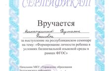 Семинарда чыгыш ясаган тәрбиячеләр "Балтач районы башкарма комитеты мәгариф идарәсе " сертификатлары белән бүләкләнделәр:Нигматуллина Р.Ф.,Закиева Г.И.,Галимова Э.Г.,Хайруллина Н.Ә.,Гарипова Д.С.,Васильева И.Т. 22.12.2015