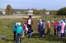 На прогулке идет закрепление пройденного материала по русскому языку. Дети средней группы играют подвижную игру «Угадай-ка». 21.09.2015