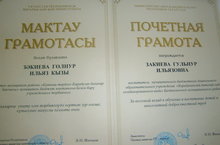 Балаларны укыту һәм тәрбияләүдә керткән зур өлеше,күпъеллык намуслы хезмәте өчен,югары категорияле тәрбияче Зәкиева Гөлнур Ильязовна Татарстан Республикасы Мәгариф һәм Фән министрлыгының Мактау грамотасы белән бүләкләнде. 16.10.2014