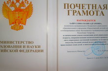 "За значительные успехи в воспитании детей дошкольного возраста,совершенствование воспитательного процесса в свете современных достижений медицины,культуры и искусства, большой личный вклад в формирование нравственных основ детей и многолетний плодотворный труд" воспитатель высшей категории Хайруллину Назию Адгамовну наградили Почетной Грамотой Министерства Образования и Науки РФ 17.10.2014