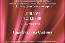 Поздравляем Гарифуллину Сафину, занявшее призовое место в Международном онлайн-конкурсе фестиваль театрального творчества имени Шауката Биктимерова" наследники Альмандара.