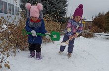 Дети средней группы активно участвуют в уборке участка от снега. Пдагоги учат их, как разгребать снегом лопатой на дорожках. В труде они учатся доброжелательно договариваться друг с другом о распределении обязанностей, инвентаря, учатся помогать друг другу, если кто-то устал или не справляется.