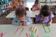 С целью развития у детей мышления и движения китсей рук провели дидактическую игру "Веселые палочки" Дети посчитали палочки по заданному числу и составили из нее геометрическую фигуру.
