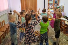 Сегодня с детьми страшей группы были в гостях у Мишки. Купили ему гостиницы, подарки. Поздравили Мишку с днем рождения, поиграли в хороводную игру "Каравай". С веселой песенкой г=на поезде вернулись в детский садик.