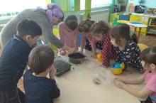 Дети подготовительной группы наблюдают за посадкой лука и вместе участвуют в ней.