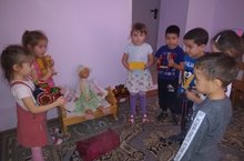 Сегодня у куклы Оли новоселье. Ребята пришли к ней с подарками - с мебелью для комнат.