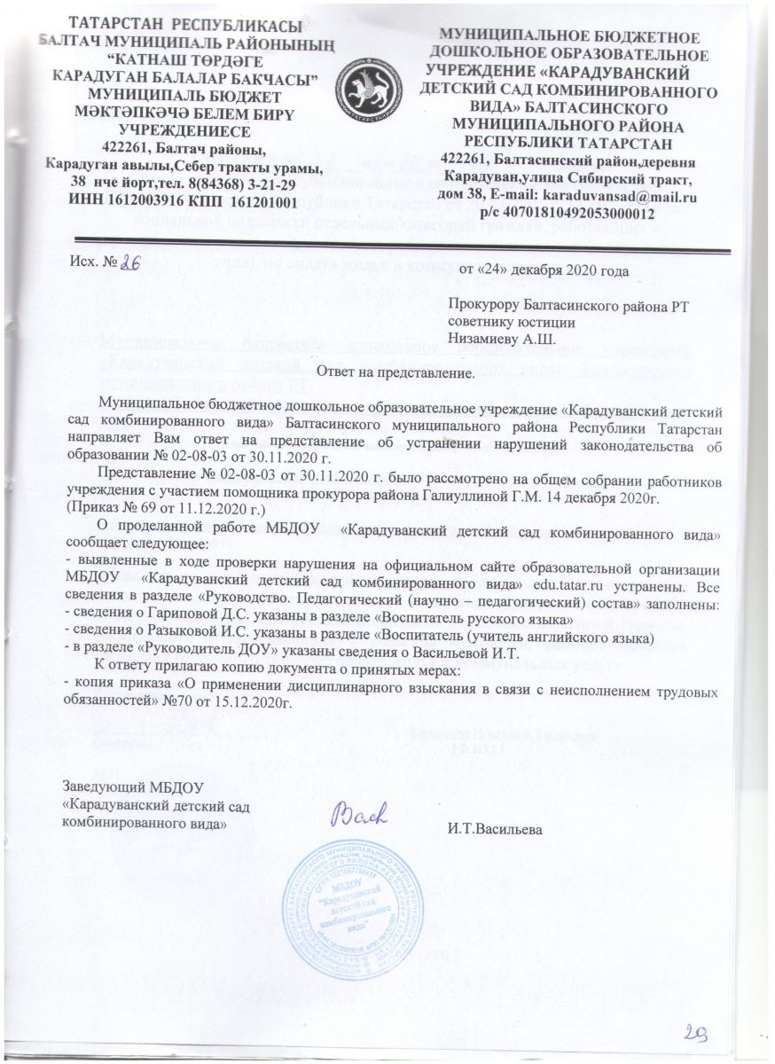 Муниципальное бюджетное дошкольное образовательное учреждение "Карадуванский детский сад комбинированного вида" Балтасинского муниципального района Республики Татарстан/Татарстан Республикасы Балтач муниципаль районы "Катнаш төрдәге Карадуган балалар бакчасы" муниципаль бюджет мәктәпкәчә белем бирү учреждениесе