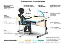 • Рабочее место школьника рекомендуется располагать у окна для достаточного естественного освещения (для ребенка правши стол необходимо расположить слева от окна, для ребенка левши - справа. Даже при наличии хорошего верхнего освещения и естественного источника света (окна), на столе необходима настольная лампа. Чтобы тени не мешали, лампу для ребенка-правши нужно поставить на столе слева, для ребенка – левши - справа.• Если на рабочем столе школьника установлен компьютер, то монитор должен находиться прямо перед глазами (чтобы ребенку не приходилось поворачиваться к нему). Экран видеомонитора должен находиться от глаз пользователя на расстоянии 600 - 700 мм.• Книги желательно ставить на подставку на расстоянии вытянутой руки от глаз. Это позволяет ребёнку держать голову прямо (снимает нагрузку на шейный отдел) и предотвращает развитие близорукости.• Необходимо сохранять во время учебных занятий правильную рабочую позу, которая наименее утомительна: сидеть глубоко на стуле, ровно держать корпус и голову; ноги должны быть согнуты в тазобедренном и коленном суставах, ступни опираться на пол, предплечья свободно лежать на столе.• Стул задвигается под стол так, чтобы при опоре на спинку между грудью ребенка и столом было расстояние равное ширине его ладони.• Нельзя опираться грудью о край парты (стола); расстояние от глаз до книги или тетради должно равняться длине предплечья от локтя до конца пальцев. Руки лежат свободно, не прижимаясь к столу, на тетради лежит правая рука и пальцы левой. Обе ноги всей ступней опираются на пол.• Если ребенок пишет, то опирается о спинку стула поясницей, при чтении материала сидит более свободно, опирается о спинку стула не только крестцово-поясничной, но и подлопаточной частью спины.Мебель должна соответствовать росту ребёнка.Для профилактики переутомления через каждые 30-45 минут занятий необходимо проводить физкультминутку и гимнастику для глаз.Согласно СанПиН 2.4.2.2821-10 учебные занятия, сочетающие в себе психическую, статическую, динамическую нагрузки на отдельные органы и системы и на весь организм в целом, требуют проведения физкультурных минуток для снятия локального утомления и общего воздействия.Рекомендуемый комплекс упражнений физкультурных минуток• Физкультминутка для улучшения мозгового кровообращения:1. Исходное положение - сидя на стуле. 1-2 - отвести голову назад и плавно наклонить назад, 3-4 - голову наклонить вперед, плечи не поднимать. Повторить 4-6 раз. Темп медленный.2. Исходное положение - сидя, руки на поясе. 1 - поворот головы направо, 2 - Исходное положение, 3 - поворот головы налево, 4 - Исходное положение Повторить 6-8 раз. Темп медленный.3. Исходное положение - стоя или сидя, руки на поясе. 1 - махом левую руку занести через правое плечо, голову повернуть налево, 2 - Исходное положение, 3-4 - то же правой рукой. Повторить 4-6 раз. Темп медленный.• Физкультминутка для снятия утомления с плечевого пояса и рук:1. Исходное положение - стоя или сидя, руки на поясе. 1 - правую руку вперед, левую вверх. 2 - переменить положения рук. Повторить 3-4 раза, затем расслабленно опустить вниз и потрясти кистями, голову наклонить вперед. Темп средний.2. Исходное положение - стоя или сидя, кисти тыльной стороной на поясе. 1-2 - свести локти вперед, голову наклонить вперед. 3-4 - локти назад, прогнуться. Повторить 6-8 раз