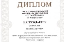 Зиятдинов Газиз - призер республиканской олимпиады "Путь к Олимпу" по математике. От всей души поздравляем Хазиза и учителя математики Садикзянову Зульфию Зайдулловну с большой победой, желаем дальнейших успехов!