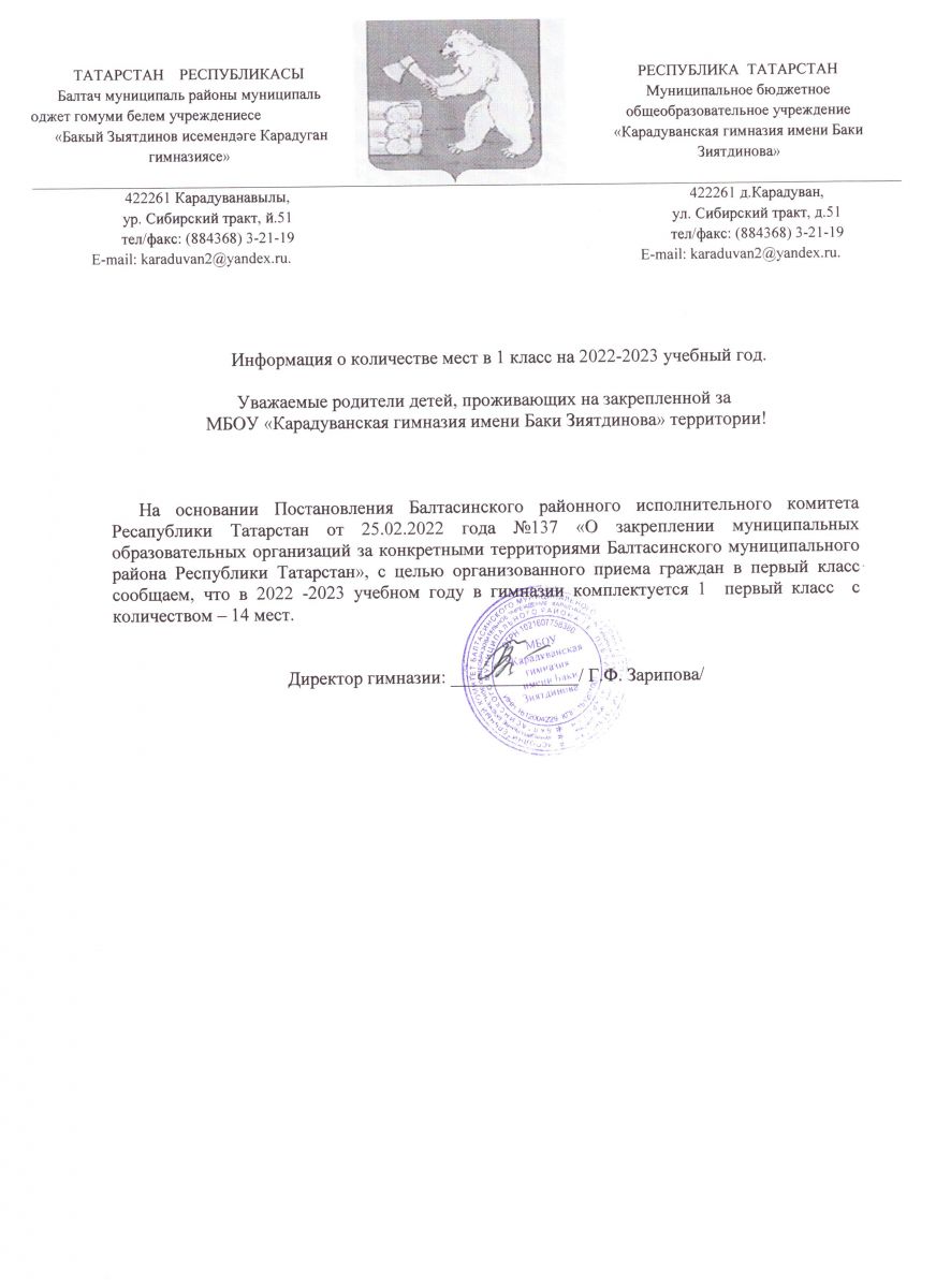 Администрация МБОУ «Карадуванская гимназия имени Баки Зиятдинова» объявляет прием детей в 1 класс на 2020-2021 учебный год.