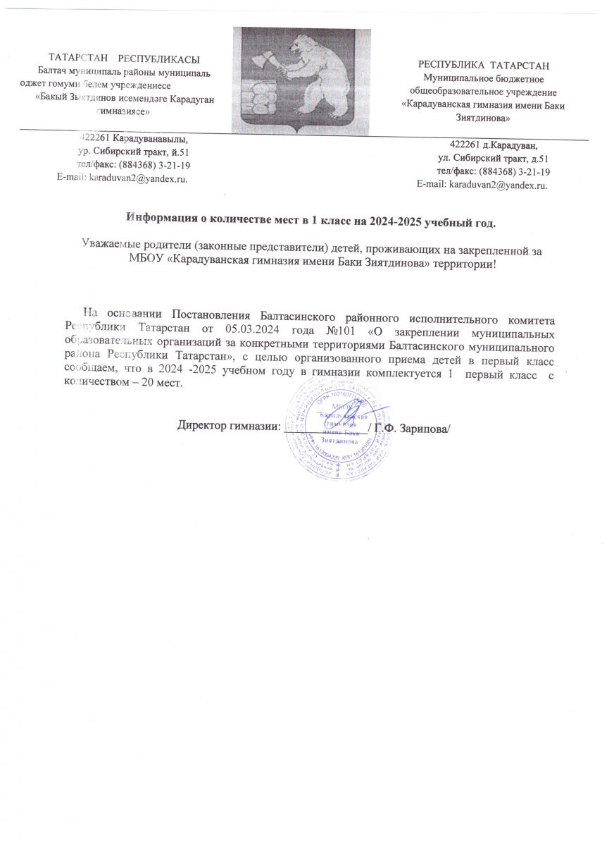 Муниципальное бюджетное общеобразовательное учреждение «Карадуванская гимназия имени Баки Зиятдинова» Балтасинского муниципального района Республики Татарстан / Татарстан Республикасы Балтач муниципаль районы муниципаль бюджет гомуми белем учреждениесе «Бакый Зыятдинов исемендәге Карадуган гимназиясе».