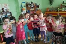 Девочки старшей группы принимают поздравления с праздником и открытки от Удодова Ярослава.