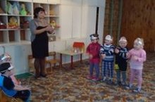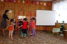 Воспитатель Филипова А.В. и малыши по пути в гости к Барбосику сделали гимнастику с кубиками, перепрыгивали через кочки и весело поиграли в ним.