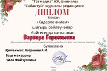 Воспитанница старшей группы Варвара Герасимова награждена дипломом за участие в онлайн-конкурсе «Дорогая мама", организованном журналом Сабантуй./Сабантуй журналы оештырган «Кадерле әнием" онлайн конкурсына катнашып, зурлар төркемендә тәрбияләнүче Варвара Герасимова диплом белән бүләкләнде./Зечкыласьком Герасимова Варвараез дипломэн!