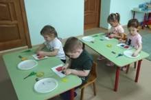 На занятиях аппликации воспитанники старшей группы закрепляют умения вырезать динные и короткие полоски, из квадратов круги и создавать из этих фигур композиции на бокальчиках/Балалар бүген геометрик фигуралар ярдәмендә бокал бизәделәр