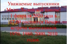 Уважаемые выпускники Мало-Лызинской школы! 1 февраля 2020 года в 17.00 состоится Вечер встречи выпускников 1970, 1980, 2000, 2010 годов. Ждем Вас.
