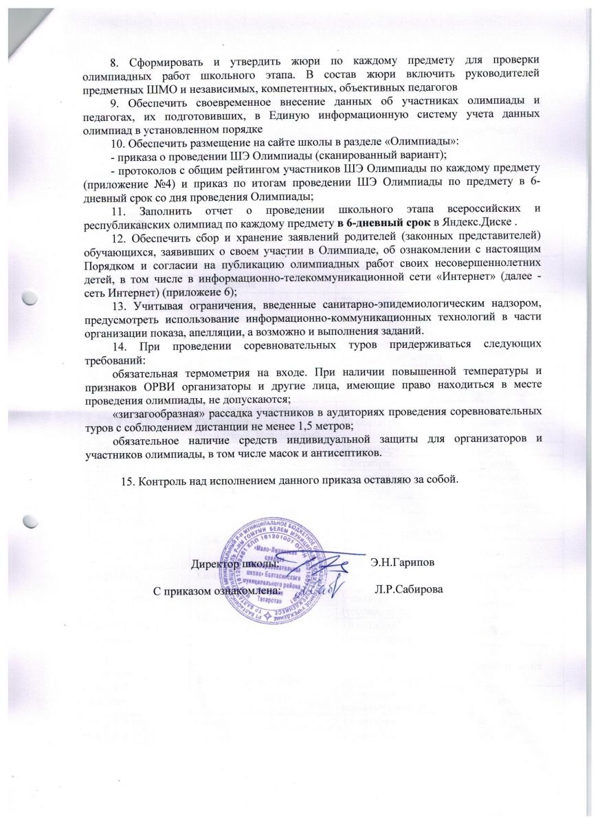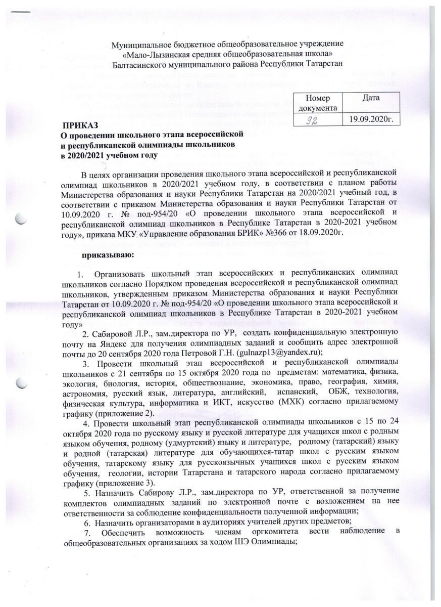 Приказ о школьном этапе олимпиад (2020-2021 учебный год) 1стр , 2 стр