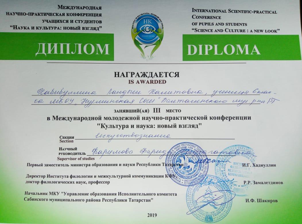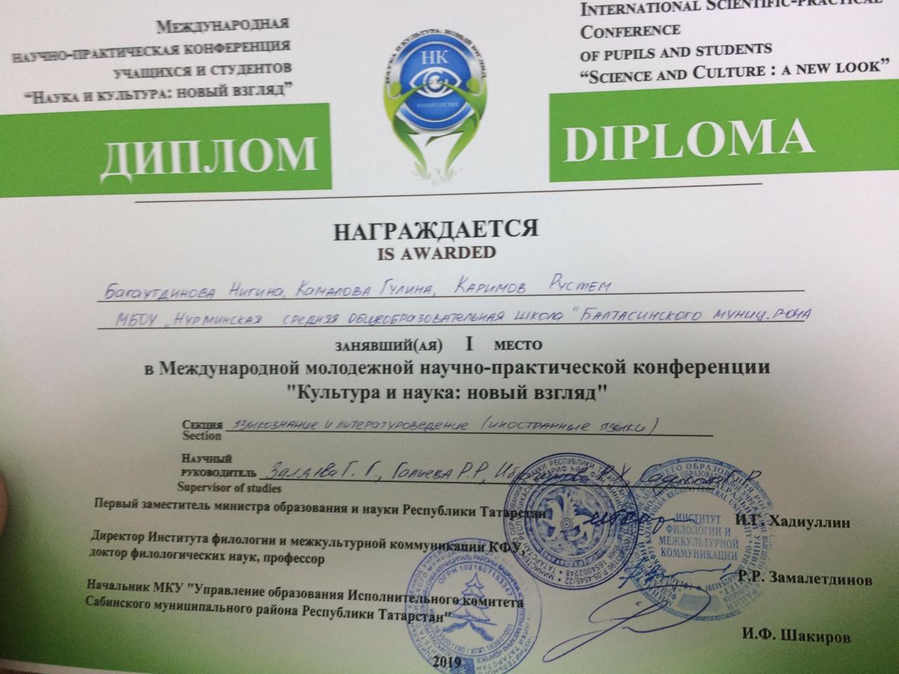 Опубликовано: 28.05.2019Халыкара яшьләр “Мәдәният һәм фән: яңа караш” фәнни-практик конференциясендә җиңүчеләр: Баһаутдинова Нигина (8а сыйныфы), Камалова Гөлинә (8б сыйныфы); Кәримов Рөстәм (10 сыйныф), Хабибуллина Ландыш (6 сыйныф)- призёр.
