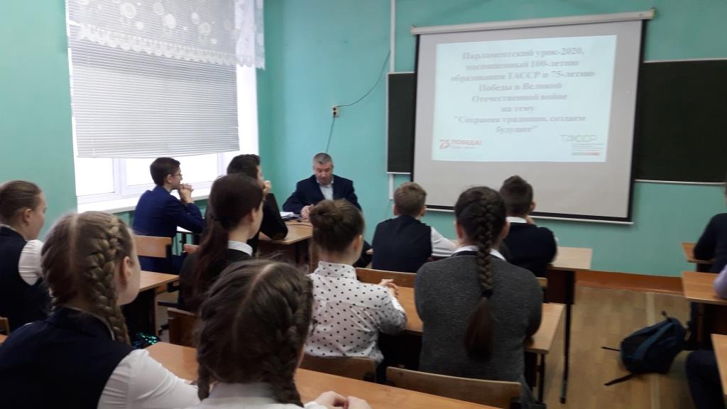 Опубликовано: 18.02.2020Парламент дәресләрен Балтач район Советы депутаты Исрафилов Сәйдәш Мәгъсүм улы, Норма җирлеге башлыгы Шарипжанов Радик Наил улы, Норма җирлеге башкарма комитеты җитәкчесе Мөбәрәкшин Илнар Илшат улы, тарих укытучылары Гибадуллин Рим Рәшит улы и Габделбарова Алсу Инзиннәт кызы үткәрделәр.