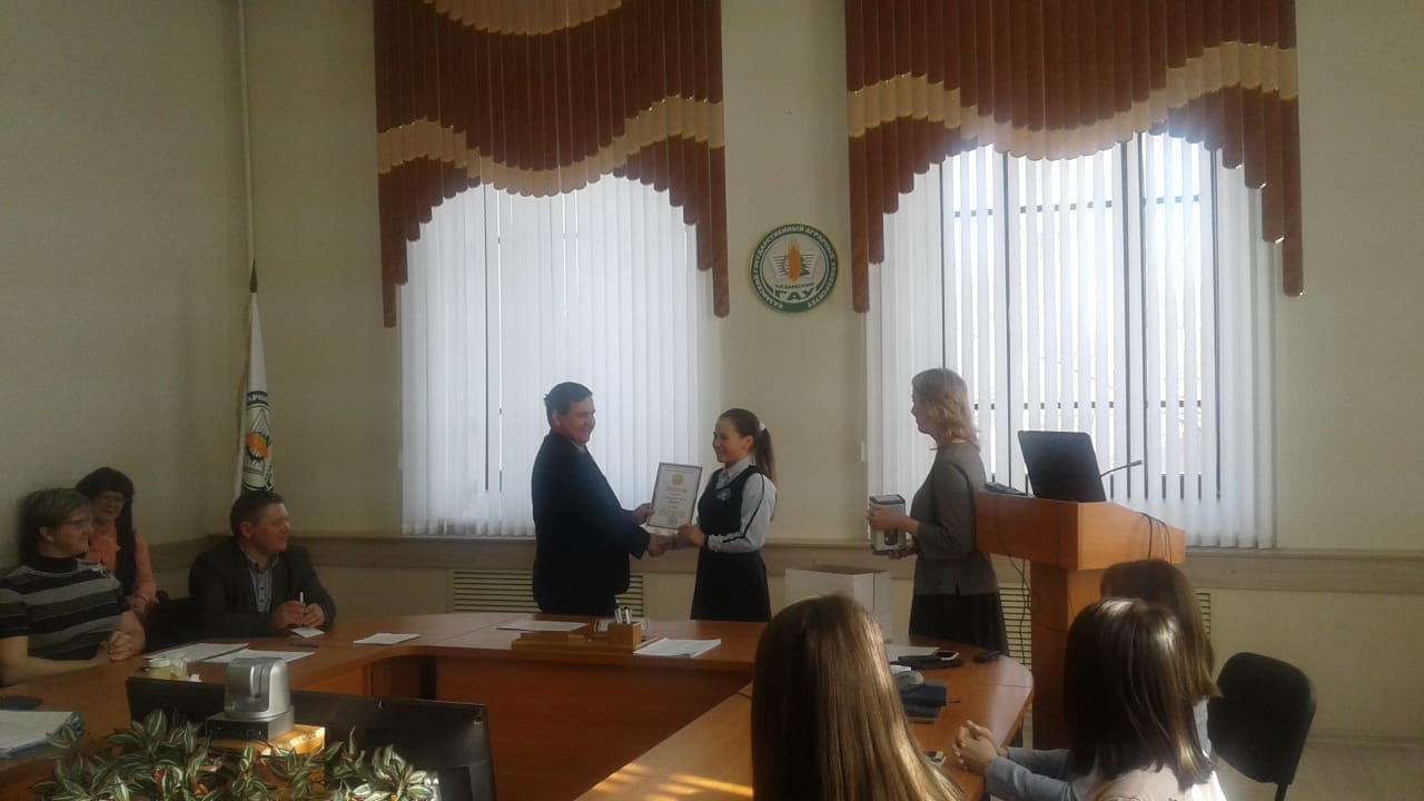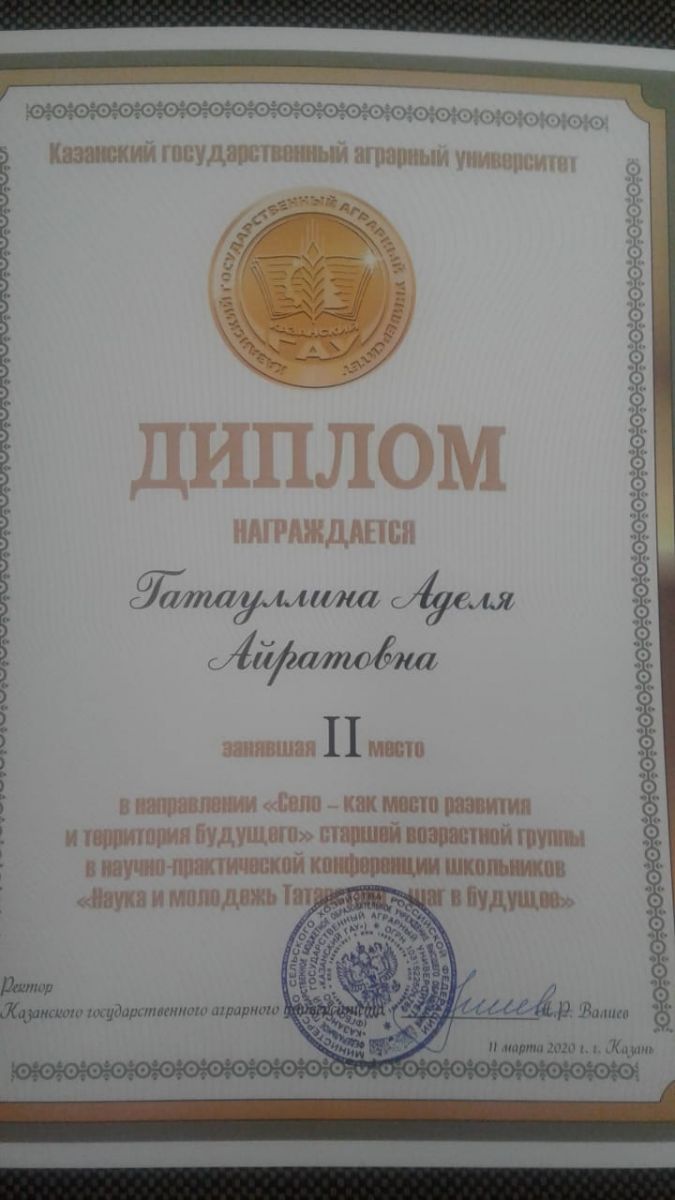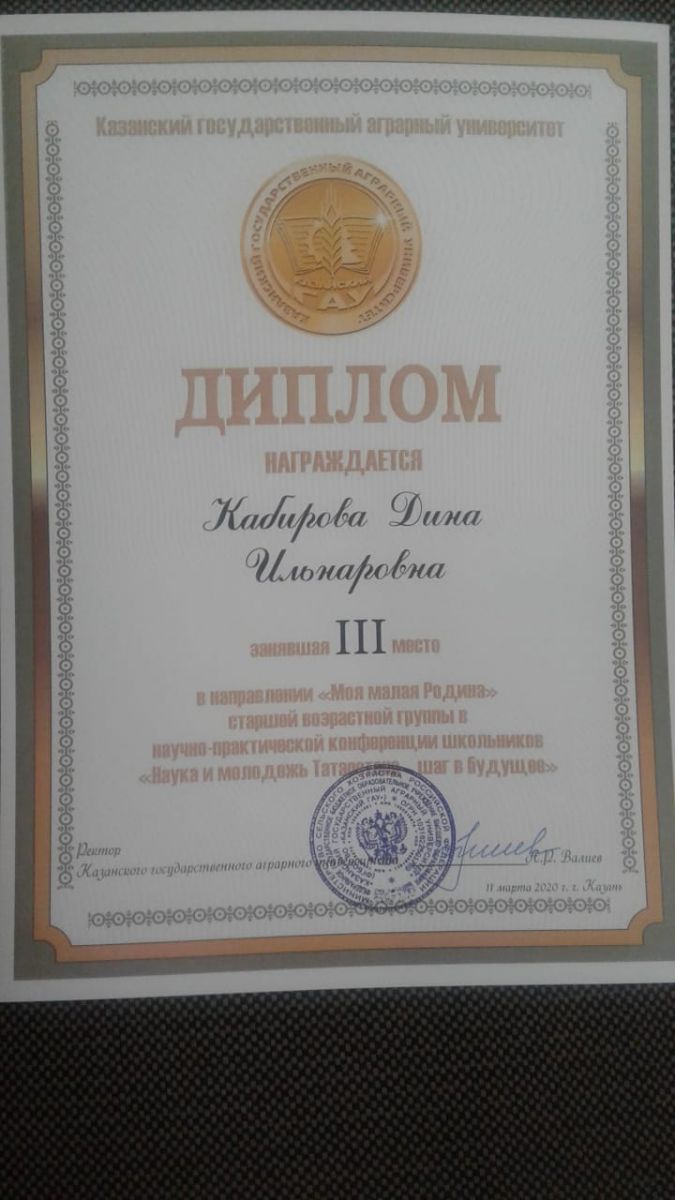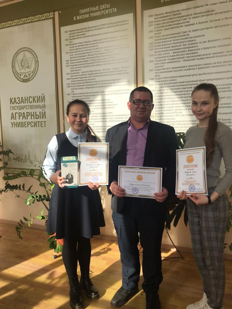 Опубликовано: 18.03.2020Казанский аграрный университет. Научно-практическая конференция школьников «Наука и молодежь Татарстана - шаг в будущее». Обучающаяся 11класса Кабирова Дина заняла 3 место, а обучающаяся 10 класса Гатауллина Аделя - 2 место. Учитель Гибадуллин Р.Р.