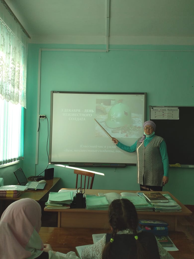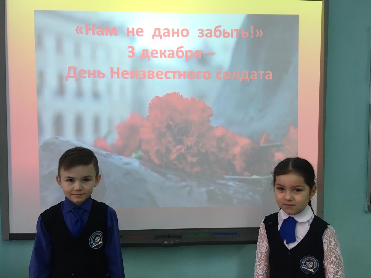 3 декабря - Всероссийская акция “День Неизвестного солдата”. В классах были проведены уроки мужества на тему  “Имя твое не известно, подвиг твой бессмертен”.