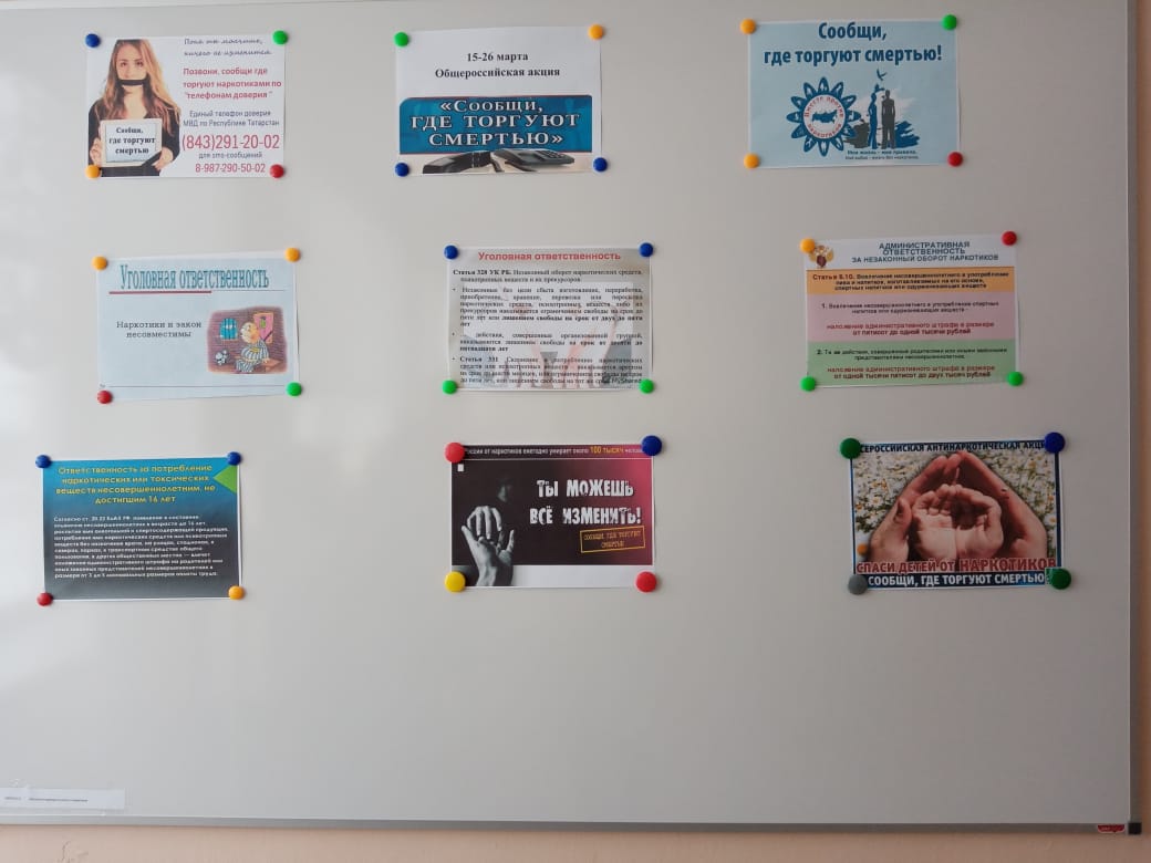 Опубликовано: 23.03.202115-26 марта проходит первый этап Общероссийской акции “Сообщи, где торгуют смертью”. В 9-11 классах прошли уроки “Моё здоровье в моих руках”. Была оформлена информационно-профилактическая доска “Наркотик и закон несовместимы”.