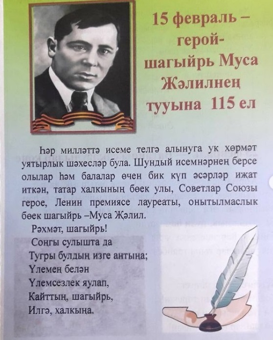 Опубликовано: 16.02.2021115 лет со дня рождения татарского поэта-героя Мусы Джалиля. В 3 А классе проведено открытое мероприятие. Учитель Файзрахманова Г.И.