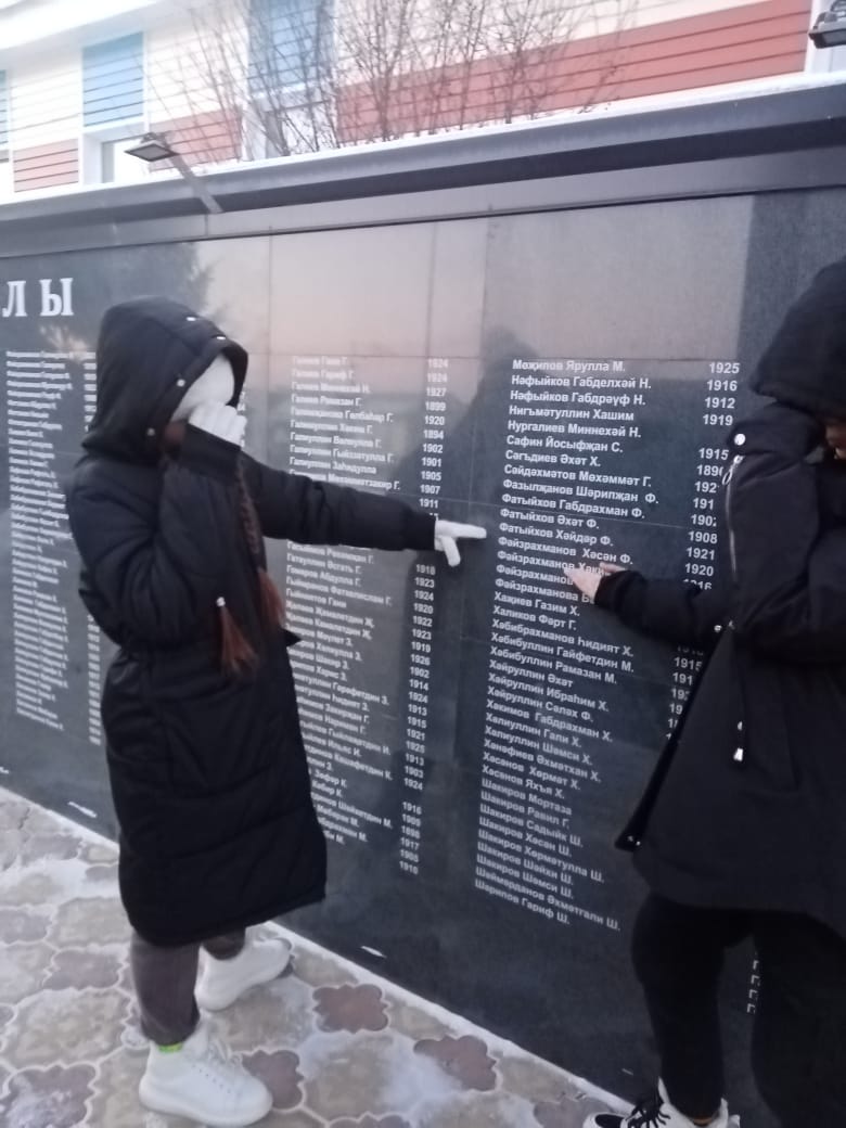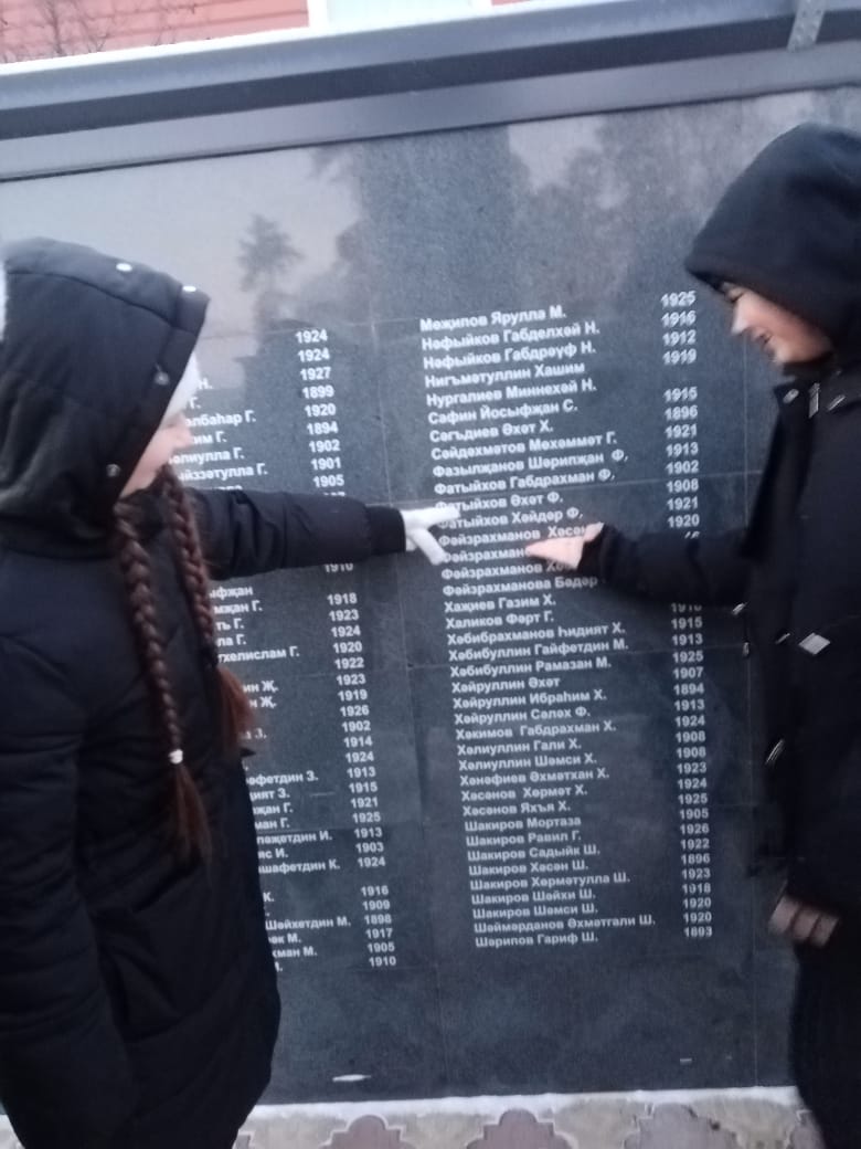 Бу көнне укучылар белән Ватан геройларын искә алдык. Ватан Геройларына багышланган кинолар карадык. Һәйкәлне чистартып Бөек Ватан сугышында катнашучыларга үзебезнең хөрмәтебезне күрсәттек.
