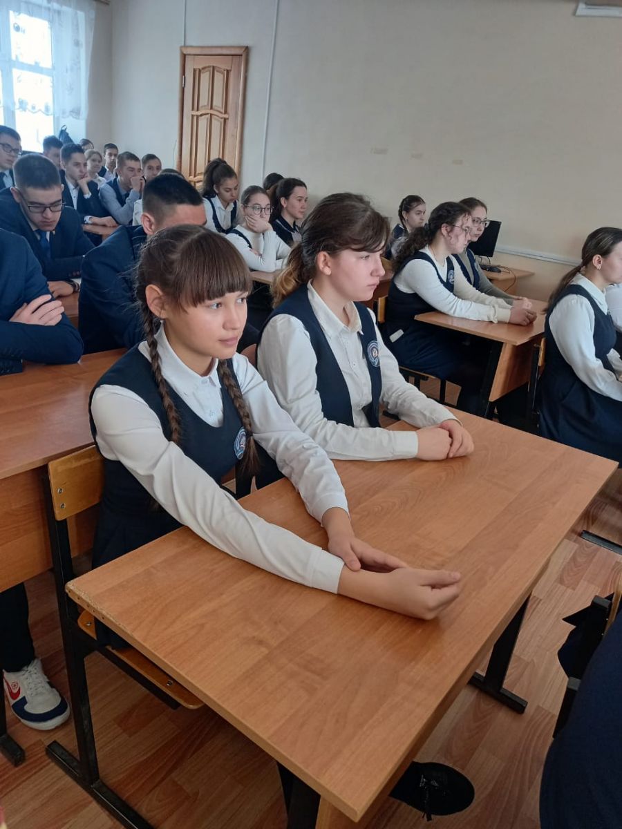 Бүген мәктәптә муниципаль хезмәткәр Ләйлә Фәргать кызы килде. Ул 9-10 сыйныф укучылары белән дөньяда килеп туган хәлләр турында әңгәмә алып барды. Әңгәмә видеоролик белән үрелеп барды. Әңгәмә ахырында сорауларга җаваплар яңгырады.