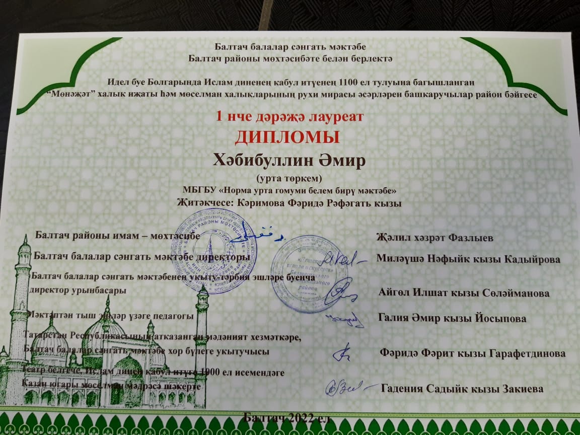 Опубликовано: 05.05.2022Хабибуллин Әмир I дәрәҗә дипломга лаек булды.