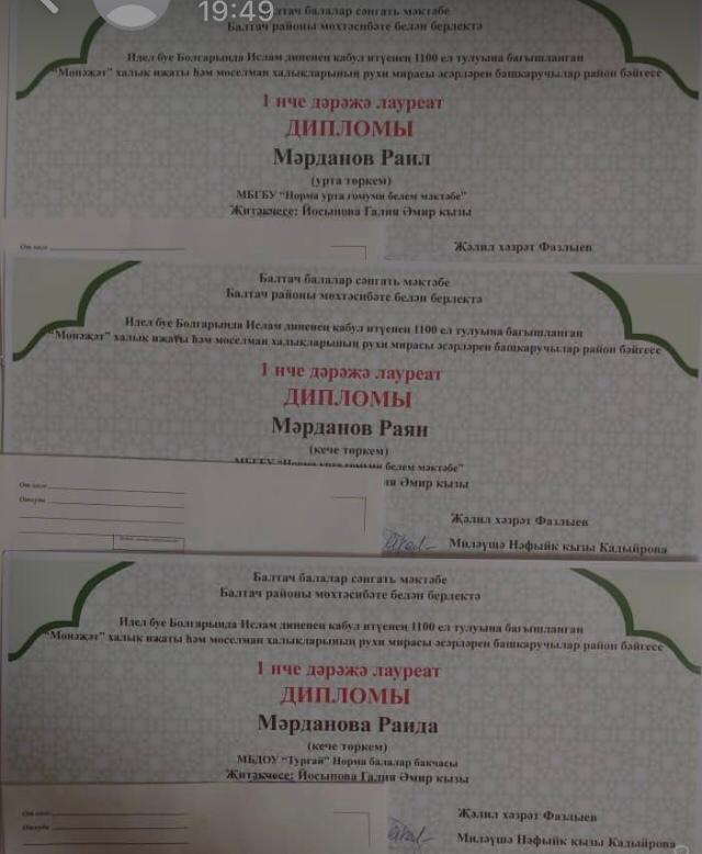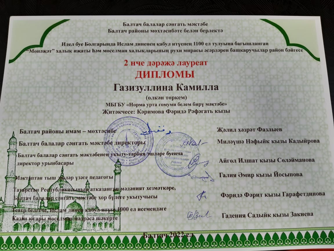 Газизуллина Камилә II дәрәҗә дипломга лаек булды. Җитәкчеләре Каримова Фәридә Рәфәгать кызы.